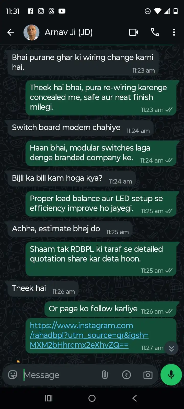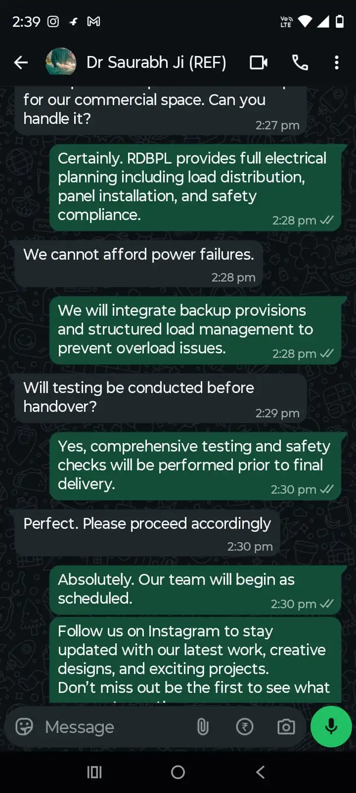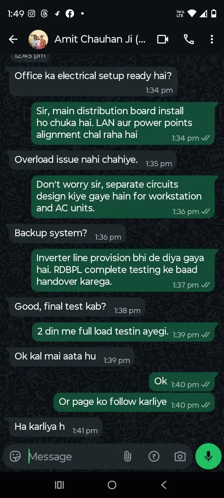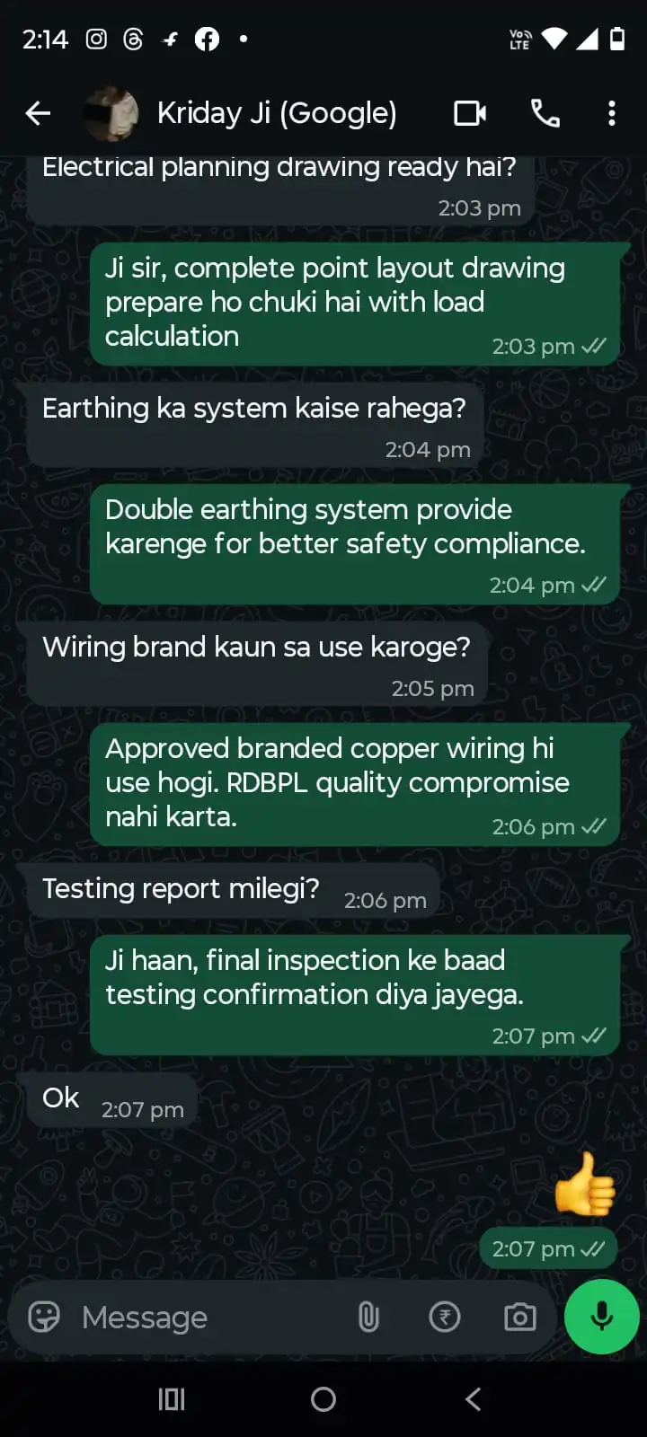 “RDBPL team completed full house electrical wiring safely and professionally. All switches, lights and MCB panel installed perfectly. Highly recommended electrical contractor in Lucknow.”