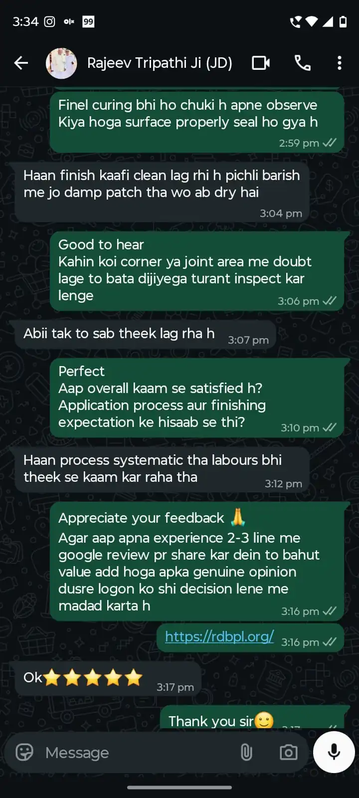 “Terrace leakage problem tha jo 2 saal se solve nahi ho raha tha. RDBPL team ne proper inspection karke waterproofing ki aur ab baarish me bilkul seepage nahi ho raha.”