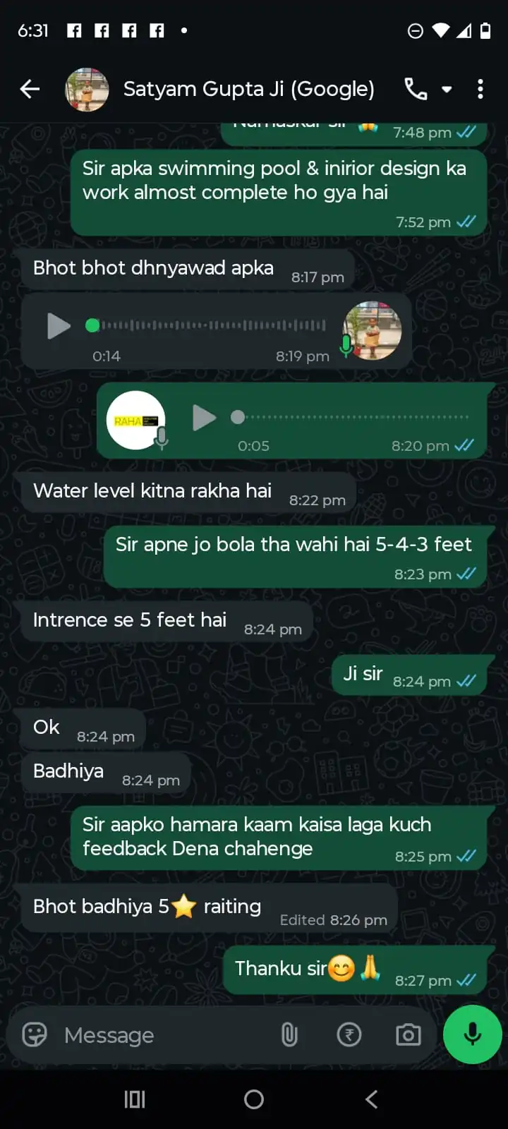 “Swimming pool construction completed on time with proper water testing. Quality of tiles and finishing exceeded expectations.”